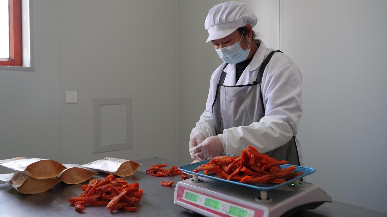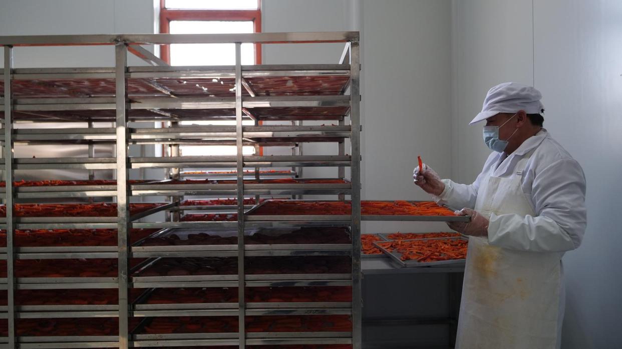 工人查看烤制完的红薯干(张美娜 摄)