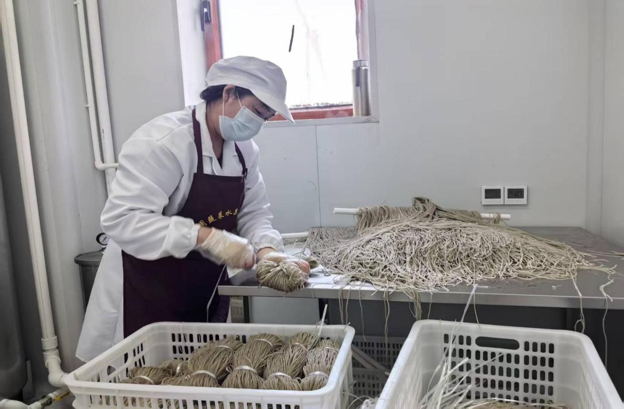 工人将红薯粉打捆(吴雅瑞 摄)