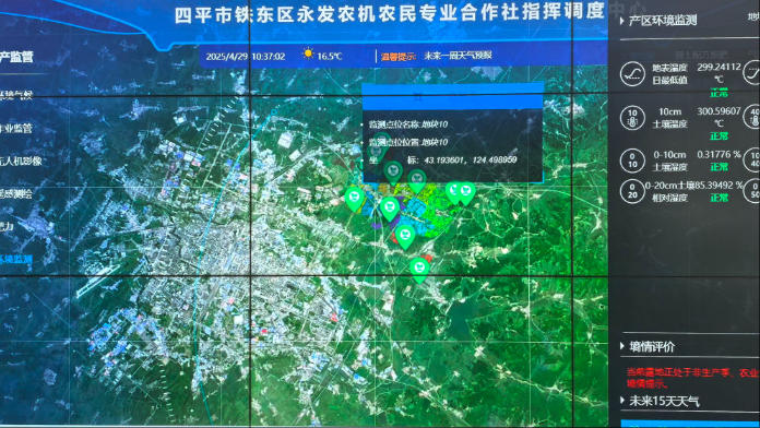 在吉林省四平市铁东区永发农机农民专业合作社指挥调度中心,大屏幕上能实时查看土地耕种进度和土壤状态(2025年4月29日摄)。新华社记者孙鹏程摄