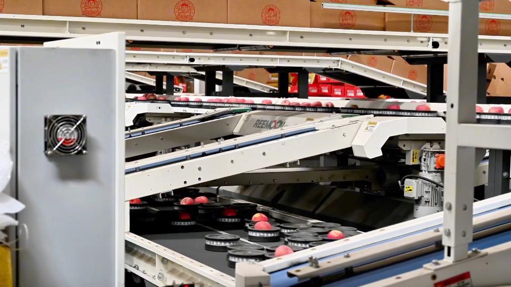 在洛川县老庙镇桥子村,智能分选机正高速运转,一颗颗色泽红润的苹果正按照重量、果型、甜度等被分成不同等级,整理装箱,发至全国各地。
