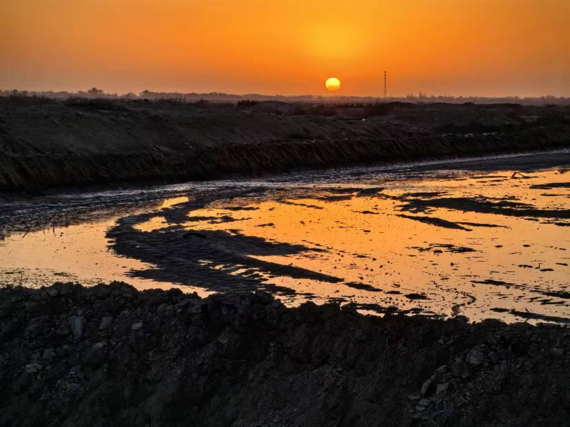 夕阳下的新疆生产建设兵团三十三团盐碱地改良田。新华网记者刘军 摄