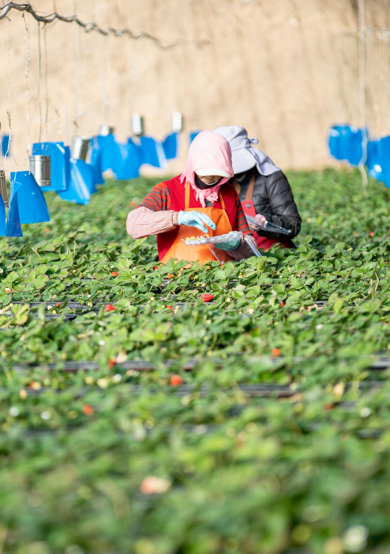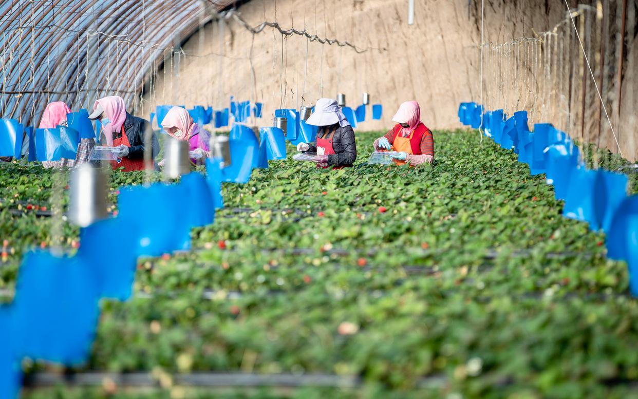 1月15日,农民在位于宁夏银川市贺兰县习岗镇的新平村设施园区草莓温棚内采摘草莓。新华社记者 杨植森 摄