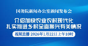 国务院新闻办公室定于2026年1月22日(星期四)上午10时举行新闻发布会,请农业农村部副部长张兴旺介绍加快农业农村现代化,扎实推进乡村全面振兴有关情况,并答记者问。